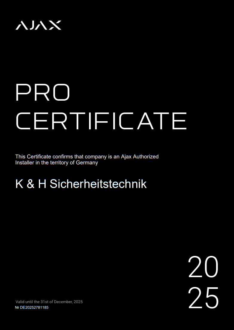 Mit zahlreichen Schulungen und Zertifizierungen, vor allem im Bereich der AJAX-Technologie, haben wir aus Kompetenz echtes Vertrauen aufgebaut. Als zertifizierter Partner dieses weltweit führenden Herstellers sind wir heute Ihr Ansprechpartner für moderne Alarmanlagen, smarte Überwachungssysteme und zuverlässige Sicherheitslösungen – für Zuhause, fürs Unternehmen oder für komplexere Objekte.